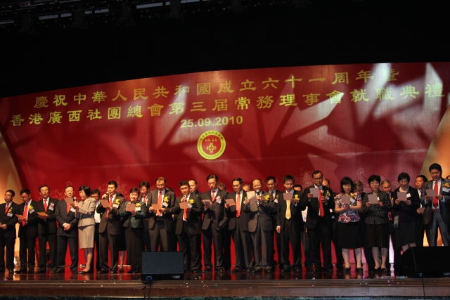 香港廣西社團總會於2010年9月25日(星期六)晚上,假座香港會議展覽中心新翼5樓大禮堂隆重舉行「慶祝中華人民共和國成立61周年國慶暨香港廣西社團總會第三屆常務理事會就職聯歡晚會」。