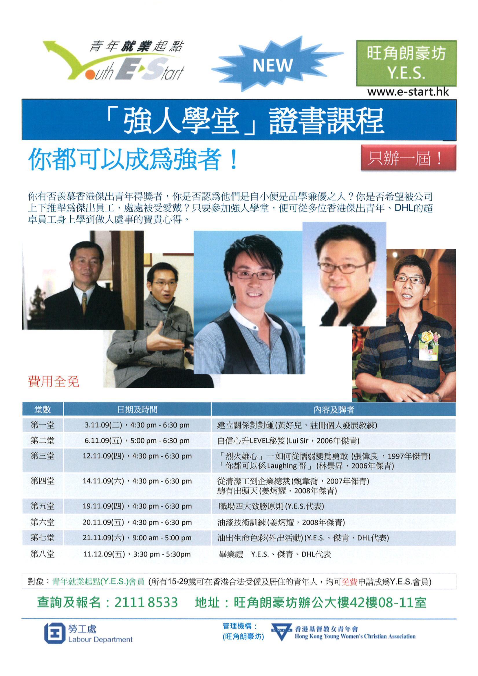 Y.E.S.最近舉辦一個名為「強人學堂」課程,共八堂。當中邀請多位香港十大傑出青年、DHL超卓員工及Y.E.S.代表分享個人成功秘訣及做人處事心得。Y.E.S.於2009年11月14日邀請了我司主席甄韋喬先生(2007年傑青)及2008年傑青姜炳耀先生為演講嘉賓。