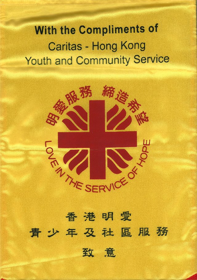 香港明愛代表陳先生頒發紀念旗予甄先生 |
