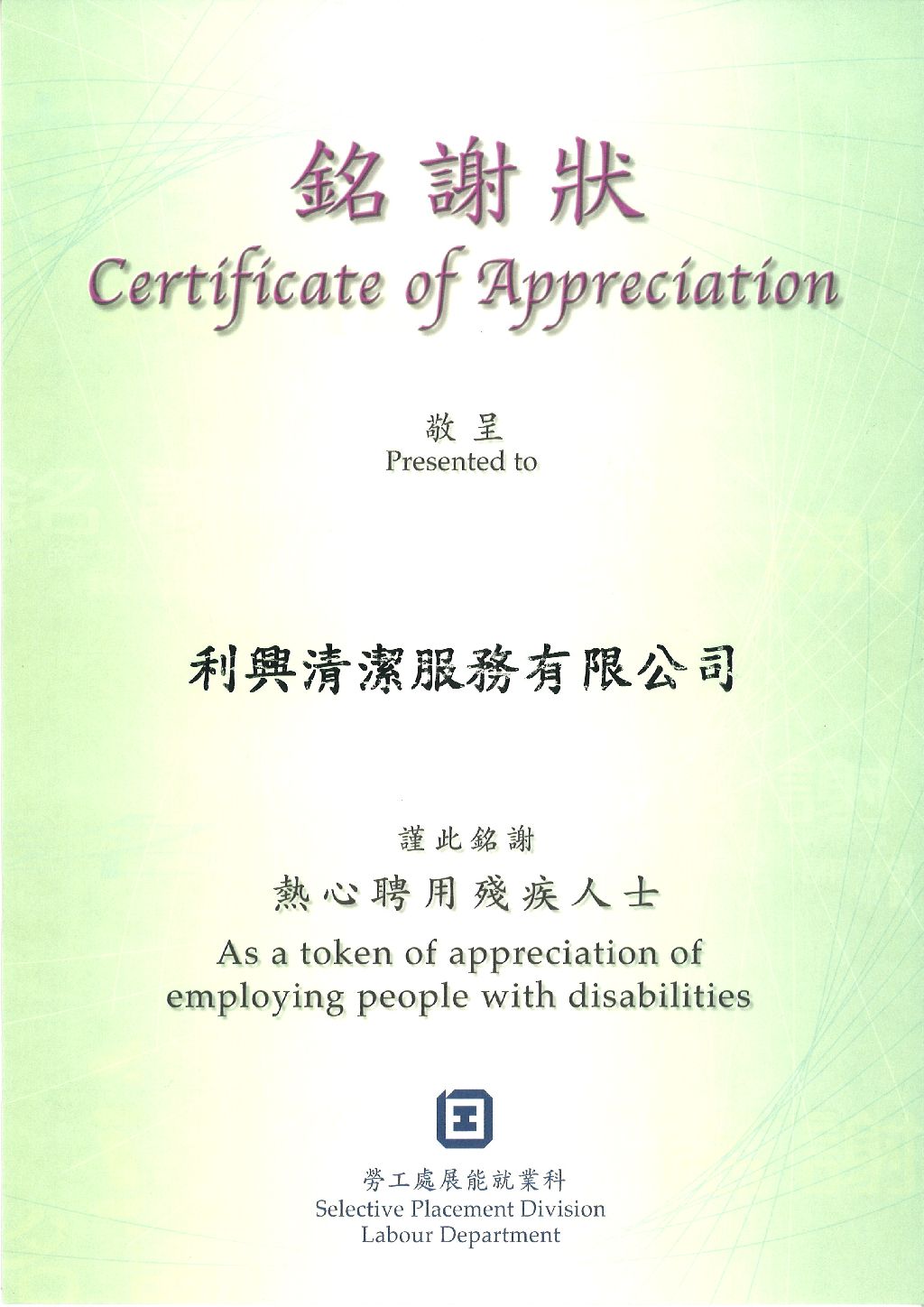 作為一間具規模的企業,「利興」於聘用員工方面向來抱著開放態度,亦致力協助各階層員工投入工作。因此,「利興」樂於聘用身體殘疾之員工,讓他們投入社會,擁有平等工作機會。過去,「利興清潔」均獲頒不少有關社會貢獻之嘉許狀。而於2008年4月28日,我司收到勞工處頒發之銘謝狀,嘉許我司去年於李鄭屋漢古墓博物館聘用一名輕度智障之員工。
