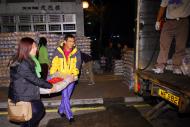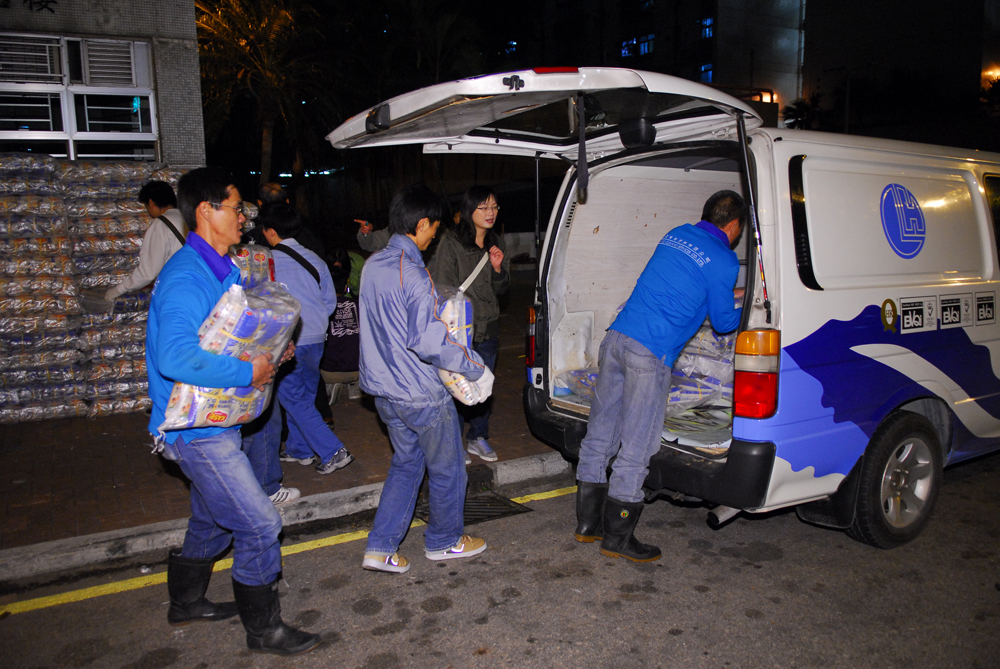 義工們冒著寒風於活動前準備白米作探訪之用 |