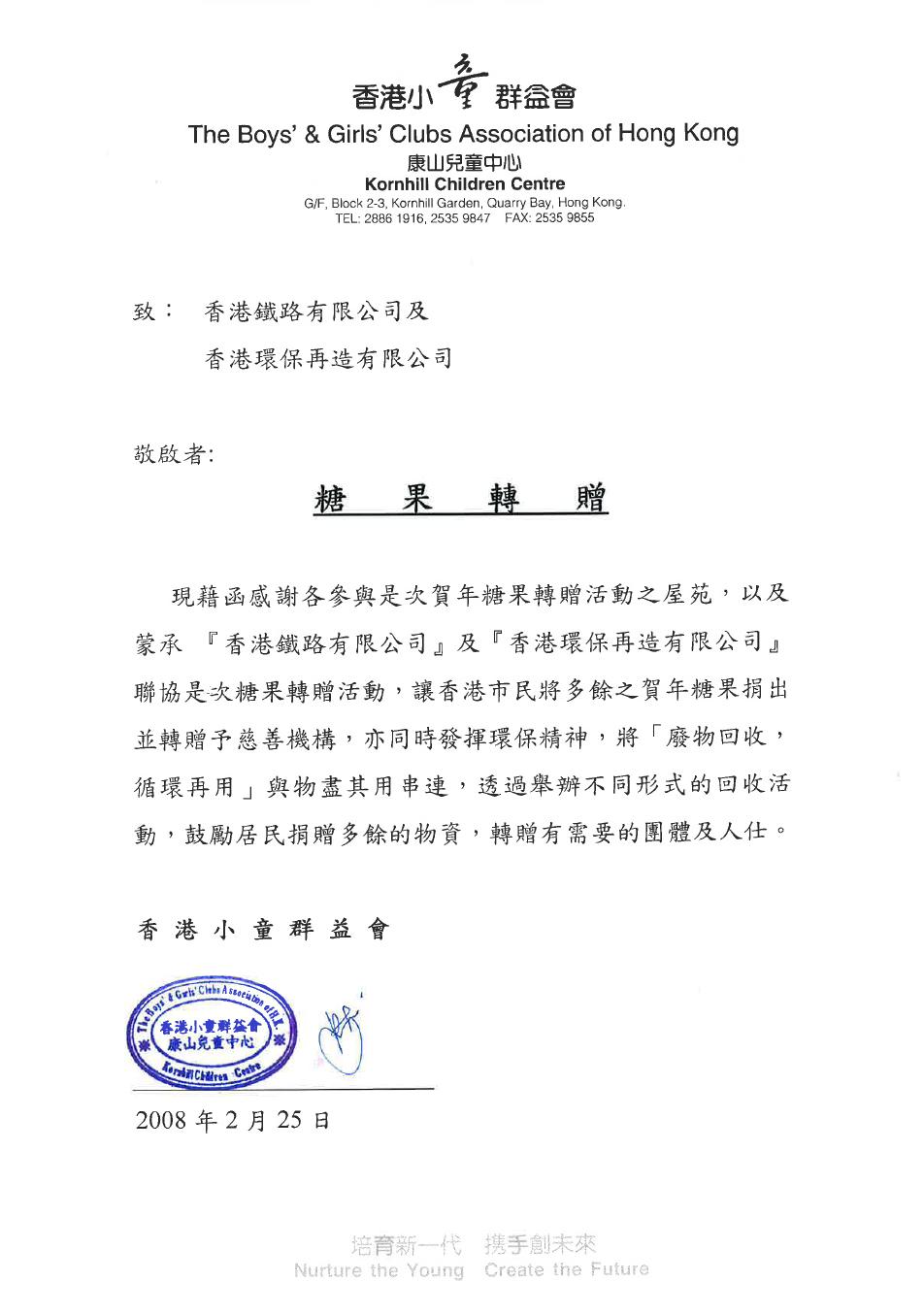 有見及此,「香港環保再造有限公司」與「香港鐵路公司」聯協之「賀年糖果轉贈活動2008」,於本年一月十六日至二月廿二日農曆年期間進行,並將回收所得之糖果禮盒轉贈「香港小童群益會–康山兒童中心」。