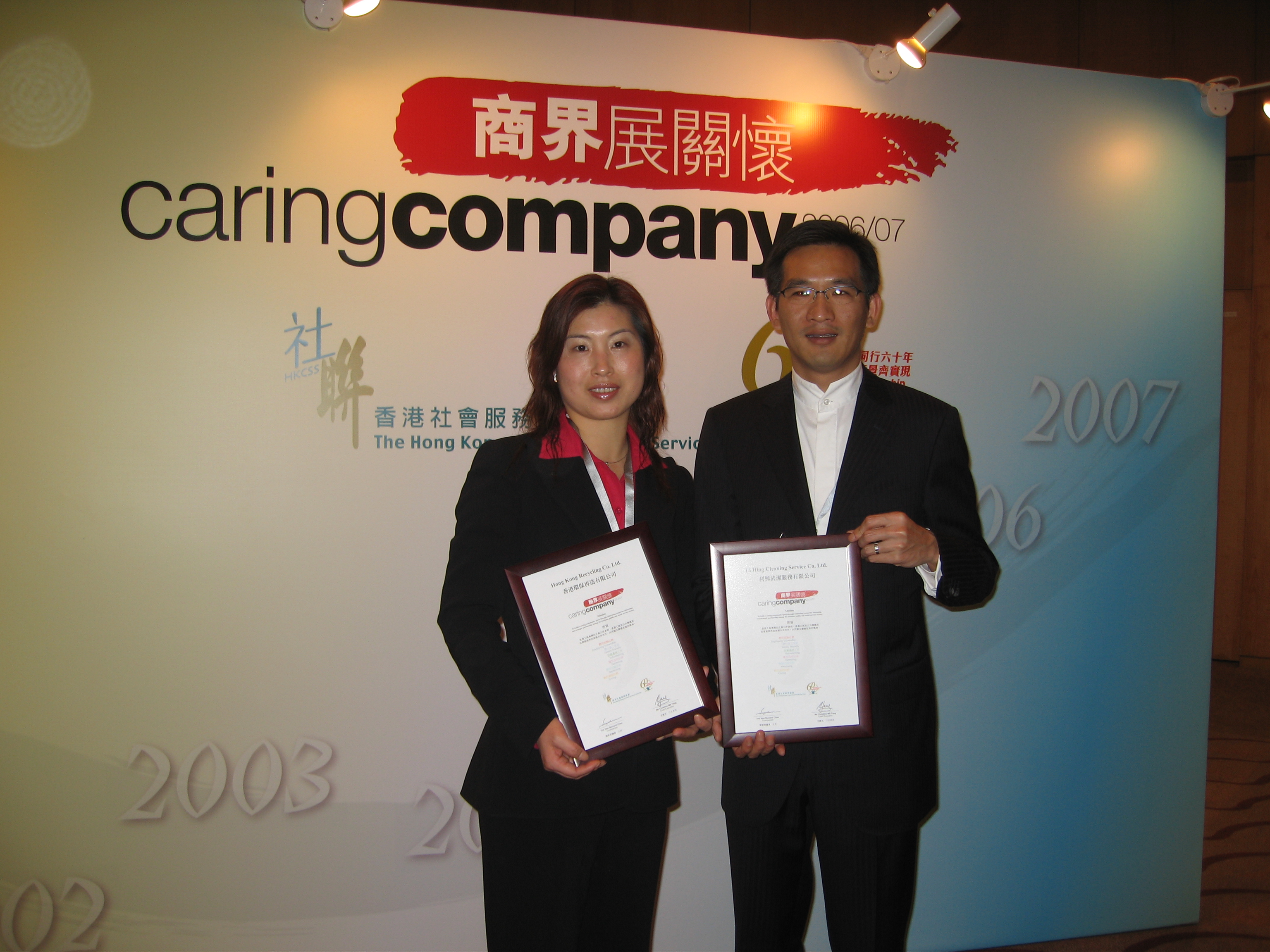 繼05-06年度後,利興清潔及香港環保兩所有限公司,再度雙雙榮獲香港社會服務聯會(社聯)所頒發之「商界展關懷06'-07'」標誌,以表揚其過去在社會福利服務及發展上所付出之貢獻。